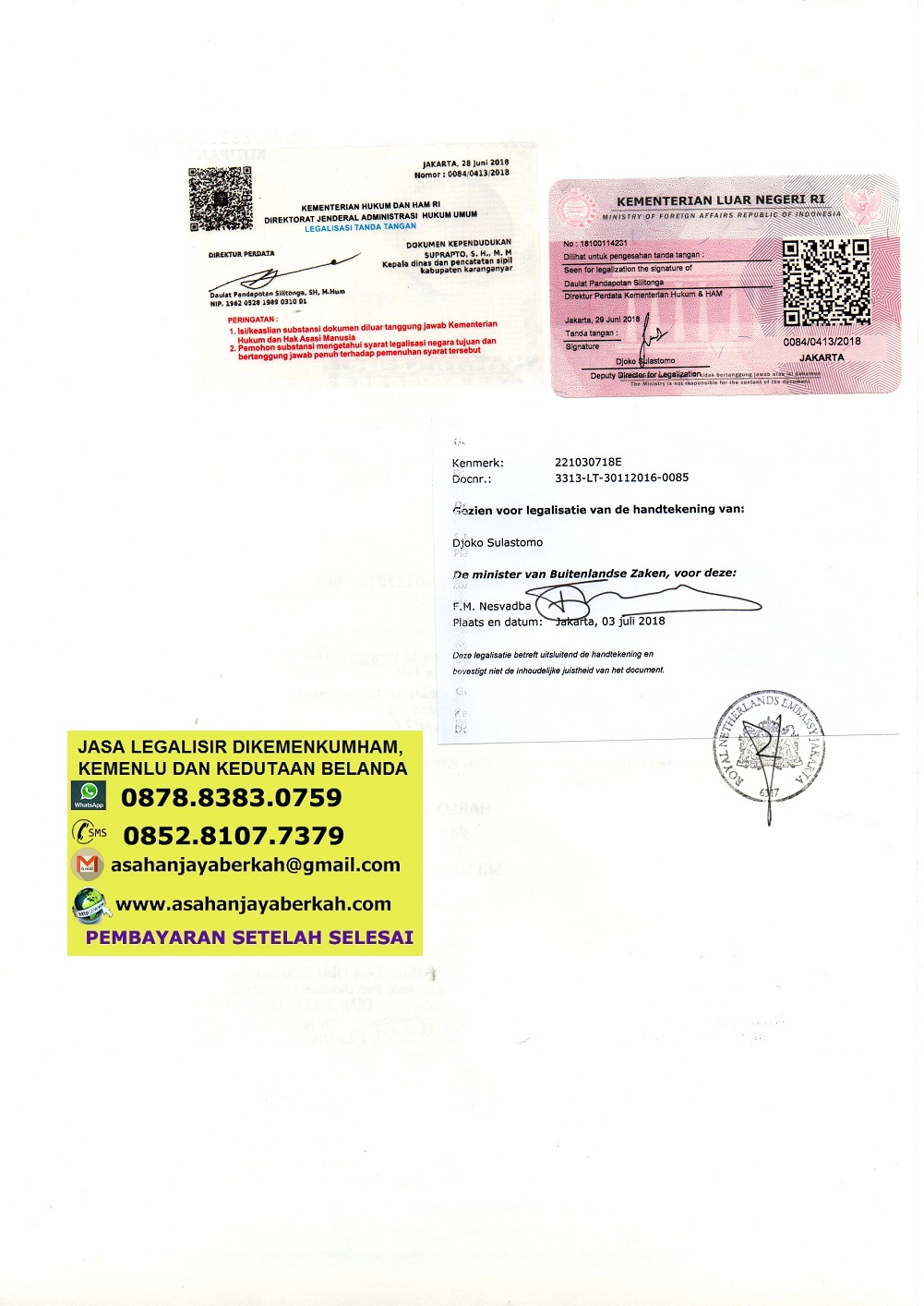 PT. Asahan Jaya Berkah adalah satu-satunya biro Jasa Legalisir Akta Kelahiran di Kedutaan Belanda Terpercaya dan Berpengalaman. Melayani Jasa Legalisir Akta Kelahiran di Kementerian Hukum dan Ham, Kementerian Luar Negeri dan Kedutaan Belanda Jakarta. Jika anda ingin Melegalisir Akta Kelahiran di Kedutaan Belanda untuk keperluan mengurus visa atau ingin Menikah di Belanda, anda tidak mau direpotkan dengan proses Legalisir Akta Kelahiran yang lama, ribet dan bertele-tele. Sekarang tidak perlu bingung. Percayakan Legalisir Akta Kelahiran anda hanya kepada kami. Proses Cepat, Syarat Mudah, Biaya Murah dan Pembayaran Setelah Selesai. Akta Kelahiran anda dijamin aman.